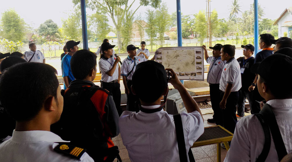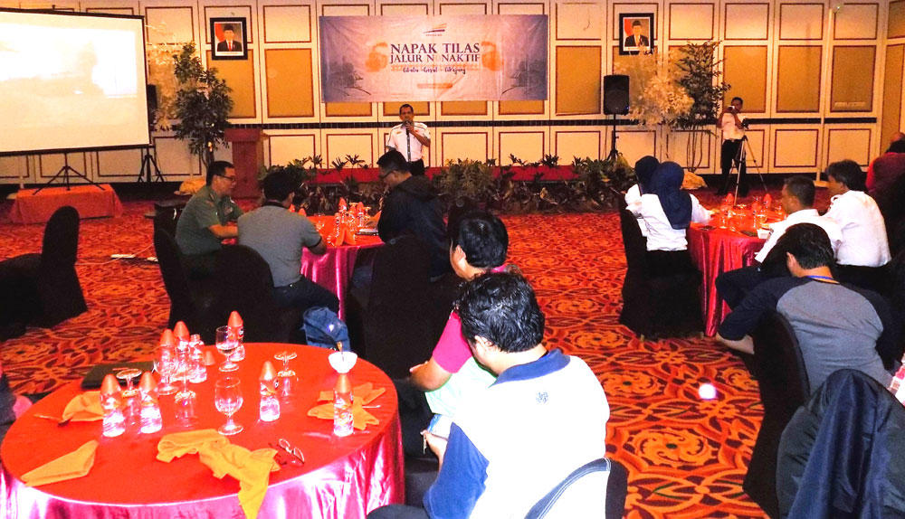 Aditya Dwi Laksana dari Kereta Anak Bangsa sedang menjelaskan poster berisikan informasi mengenai jalur dan aset peninggalan